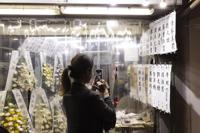 A woman takes a photos as she pays respect to singer and songwriter Coco Lee outside a funeral home in Hong Kong, Monday, July 31, 2023. Lee died July 5 at age 48. (AP Photo/Louise Delmotte)
