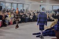 As models paraded in oversized beige bowler hats and loose ’70s check suits with retro boho collars, the collection danced between nostalgia and avant-garde theatrics.