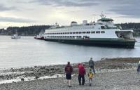 In this photo posted to the Washington state Department of Ecology website and taken by the U.S. Coast Guard, people watch as emergency crews respond to the Walla Walla passenger ferry, which ran aground near Bainbridge Island west of Seattle, Saturday, April 15, 2023. (Lt. Cmdr. Brian Dykens/U.S. Coast Guard via AP)