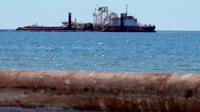 A dredge boat pumps sand back onto the beach along the gulf Thursday, Sept. 25, 2025, in Indian Rocks Beach, Fla. (AP Photo/Chris O'Meara)