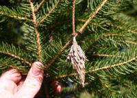 This 2010 image provided by shows a bagworm cocoon hanging from a conifer branch in Ky. Bagworms are destructive pests that surround themselves in cocoons they construct from leaves and other plant parts, which, on conifer trees, can be mistaked for pinecones. (William Fountain/University of Kentucky/Bugwood.org via AP)