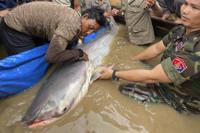 The first two were on the Tonle Sap river, a tributary of the Mekong not far from Cambodian capital Phnom Penh. They were given identification tags and released. On Tuesday, fishermen caught four more giant catfish including two longer than 2 meters (6.5 feet) that weighed 120 kilograms and 131 kilograms (264 pounds and 288 pounds), respectively. The captured fish were apparently migrating from their floodplain habitats near Cambodia's Tonle Sap Lake northward along the Mekong River, likely to spawning grounds in northern Cambodia, Laos or Thailand.