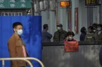 FILE - A woman wearing a face masks talks on her phone as masked residents stand near the metal barriers set up in their locked down neighborhood as part of COVID-19 controls in Beijing, Thursday, Nov. 10, 2022. (AP Photo/Andy Wong, File)