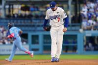 Los Angeles Dodgers pitcher Blake Snell (7) looks on after giving up a solo home run as Toronto Blue Jays' Vladimir Guerrero Jr. (27) rounds the bases during first inning Game 5 World Series playoff MLB baseball action in Los Angeles on Wednesday, Oct. 29, 2025. THE CANADIAN PRESS/Frank Gunn