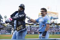 Toronto Blue Jays' Davis Schneider (36) celebrates his solo home run with designated hitter Bo Bichette (11) during first inning Game 5 World Series playoff MLB baseball action against the Los Angeles Dodgers in Los Angeles on Wednesday, Oct. 29, 2025. THE CANADIAN PRESS/Frank Gunn