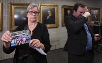 Lawyer Patrick Martin-Menard, right, reacts as his client Sylvie Brosseau shows a photo of her husband surrounded by their grandchildren at the courthouse in Montreal on Thursday, May 15, 2025. Brosseau's partner, Normand Meunier requested medical assistance in dying last year after getting pressure sores during a stay in the St-Jerome hospital. THE CANADIAN PRESS/Christinne Muschi