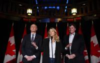 Minister of Foreign Affairs Melanie Joly is flanked by Minister of Public Safety David McGuinty, left, and Minister of Finance and Intergovernmental Affairs Dominic LeBlanc as they speak to reporters prior to a meeting during a cabinet retreat at Chateau Montebello in Montebello, Que., on Monday, Jan. 20, 2025. THE CANADIAN PRESS/Sean Kilpatrick