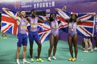 British sprinters from left; Joe Ferguson, Jeriel Quainoo, Kissiwaa Mensah, and Asha Philip celebrate after winning the bronze medals in 4x100 meters mixed relay at the World Athletics Relay, in Guangzhou in south China's Guangdong province on Sunday, May 11, 2025. (Chinatopix Via AP)