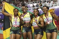 Jamaican sprinters from left, Tina Clayton, Shericka Jackson, Shelly-Ann Fraser-Pryce, and Natasha Morrison celebrate after winning the bronze medals in women's 4x100 meters relay at the World Athletics Relays, in Guangzhou in south China's Guangdong province, Sunday, May 11, 2025. (Chinatopix Via AP)