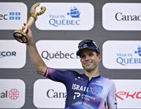 Team Israel Premier Tech rider Guillaume Boivin of Montreal raises his trophy as the top ºÚÁϳԹÏÍø at the Grand Prix Cycliste de Quebec, Friday, September 8, 2023 in Quebec City. Boivin placed 41st. THE CANADIAN PRESS/Jacques Boissinot