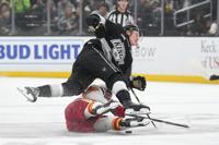 Los Angeles Kings center Samuel Helenius, top, trips over Calgary Flames left wing Aydar Suniev during the first period of an NHL hockey game Thursday, April 17, 2025, in Los Angeles. (AP Photo/Mark J. Terrill)