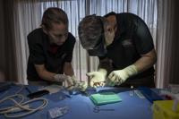 In this photograph released by the Leibniz Institute for Zoo and Wildlife Research, Dr. Thomas Hildbrandt, head of projects, right, holds a white rhinoceros embryo that was created in a lab from an egg and sperm that had been previously collected from other rhinos and later transferred into a southern white rhino surrogate mother, in Kenya Nov. 29, 2023. A rhinoceros is pregnant through embryo transfer in the first successful use of a method that conservationists said could be used to try to save the nearly extinct northern white rhino subspecies. (Jon Juarez/IZW via AP)