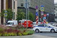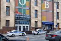 Police and emergency cars and a truck are parked at an entrance of the Central Children's Store (Detsky Mir) after a blast that was reportedly caused by the explosion of a gas balloon, on the Lubyanka square near the headquarters of the Federal Security Service (FSB), the successor of KGB in Moscow, Russia, Sunday, Aug. 24, 2025. (Moscow News Agency via AP)
