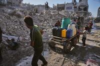 Palestinians carry water amid the ruins of Gaza City, Sunday, Oct. 26, 2025. (AP Photo/Jehad Alshrafi)