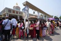 Hindu devotees stand in queue to offer prayers at Kalighat Kali Temple, seen at back, on the occasion of Bengali New Year's day in which traders in West Bengal open their new account books for the year after offering prayers to Hindu deities Kali, Lakshmi and Ganesha to bring them prosperity, in Kolkata, India, Tuesday, April 15, 2025. (AP Photo/Bikas Das)
