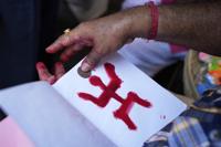 A Hindu priest marks a trader's account book with holy symbols on the occasion of Bengali New Year's day in which traders in West Bengal open their new account books for the year after offering prayers to Hindu deities Kali, Lakshmi and Ganesha to bring them prosperity, in Kolkata, India, Tuesday, April 15, 2025. (AP Photo/Bikas Das)