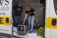 Volunteers Peter Brown and Eileen Johnson unload puppies transported from shelters affected by flooding in Texas at PAWS Chicago Medical Center, Wednesday, July 16, 2025, in Chicago. (AP Photo/Erin Hooley)