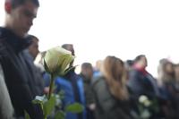 Students hold white flowers in front of the court building during a verdict in trial of parents of a boy who killed 9 students and security guard in school shooting in 2023, in Belgrade, Serbia, Monday, Dec. 30, 2024. (AP Photo/Darko Vojinovic)