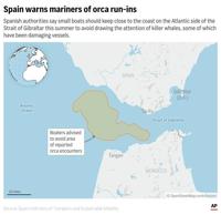 Recent episodes of orcas damaging boats near the Strait of Gibraltar have prompted Spanish authorities to recommend that small vessels stick to coastal areas where encounters are less likely. (AP Graphic)