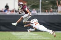 Mississippi State wide receiver Anthony Evans III, top, hurdles Texas defensive back Warren Roberson, bottom, during the first half of an NCAA college football game in Starkville, Miss., Saturday, Oct. 25, 2025. (AP Photo/James Pugh)