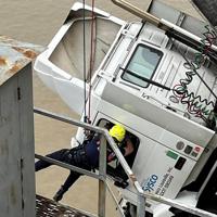 This photo provided by Louisville Division of Fire, Louisville Fire Dept. Louisville firefighter Bryce Carden prepares to rescue the driver of semitruck that is dangling off the Clark Memorial Bridge over the Ohio River on Friday, March 1, 2024 in Louisville, Ky. The driver was pulled to safety by firefighters following the three-vehicle crash on the bridge connecting Louisville, Kentucky to southern Indiana(Louisville Division of Fire via AP)