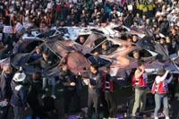 Protesters tear a banner with a face image of U.S. President Donald Trump during a rally in Gyeongju, South Korea, Wednesday, Oct. 29, 2025. (AP Photo/Lee Jin-man)